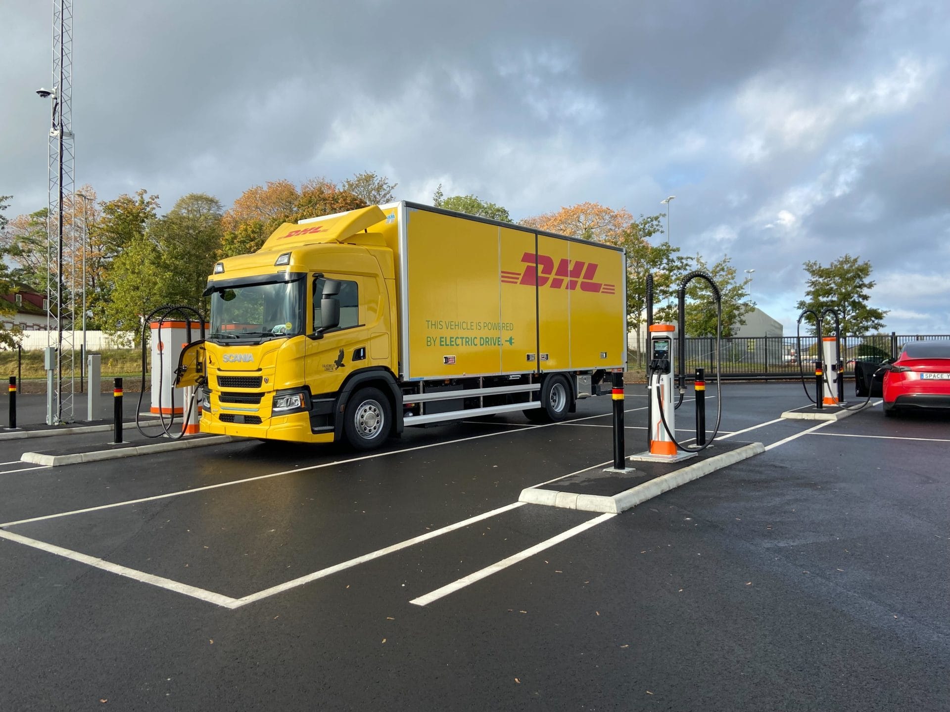 Imagen de una estación de recarga de camiones eléctricos de Falkenklev Logistiks en Suecia