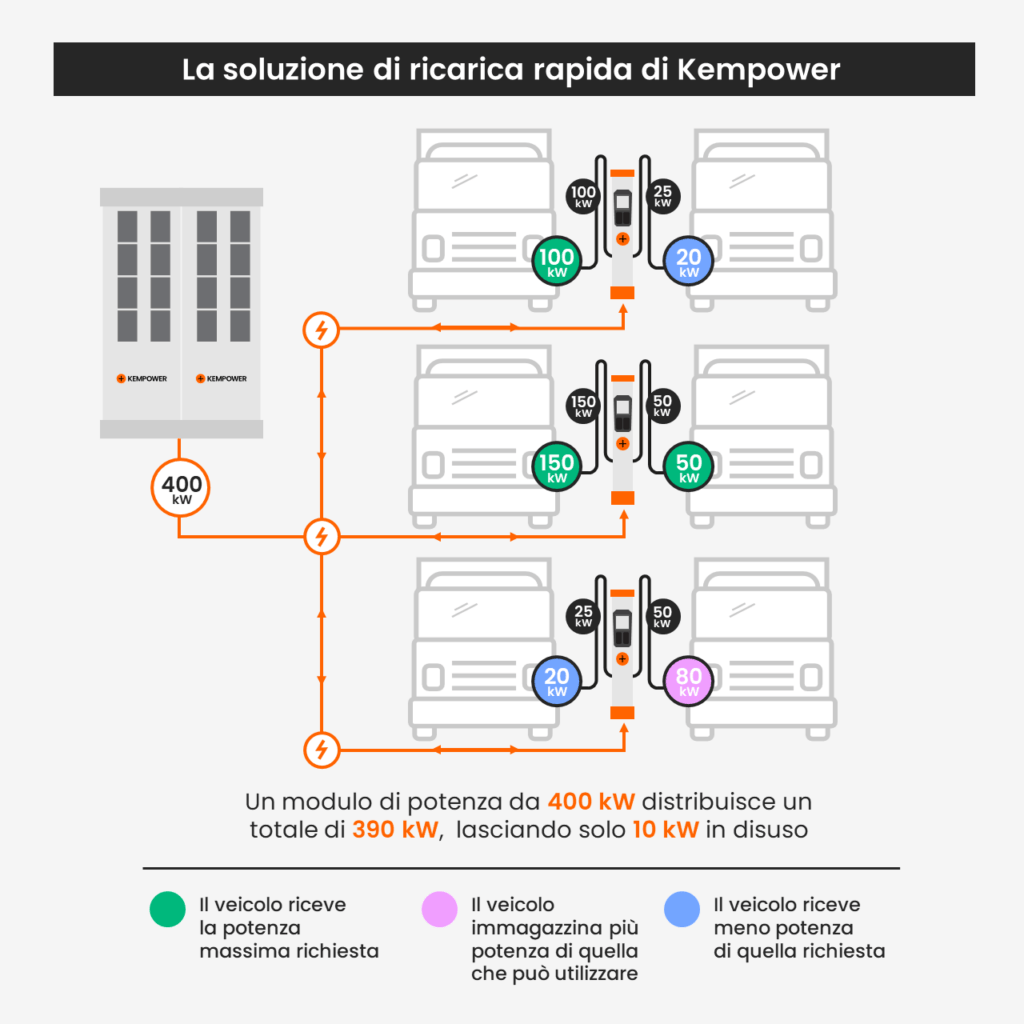 Grazie alla soluzioni di Kempower è possibile ottimizzare la ricarica di più veicoli massimizzando l’utilizzo della potenza.
