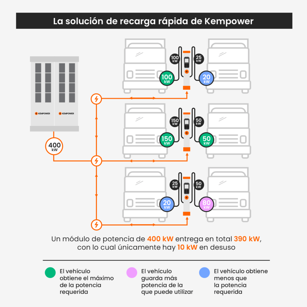- Las limitaciones de la red eléctrica deben solucionarse con arquitecturas de recarga de alta eficiencia. El enfoque de uso compartido de la potencia dinámica es el diferenciador de Kempower y aprovecha al máximo la utilización de la red eléctrica.