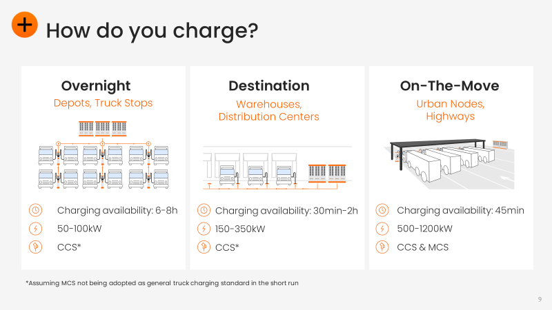 To differentiate between charging methods for heavy-duty electric trucks, let’s discuss both different charging scenarios and truck electrification stages.