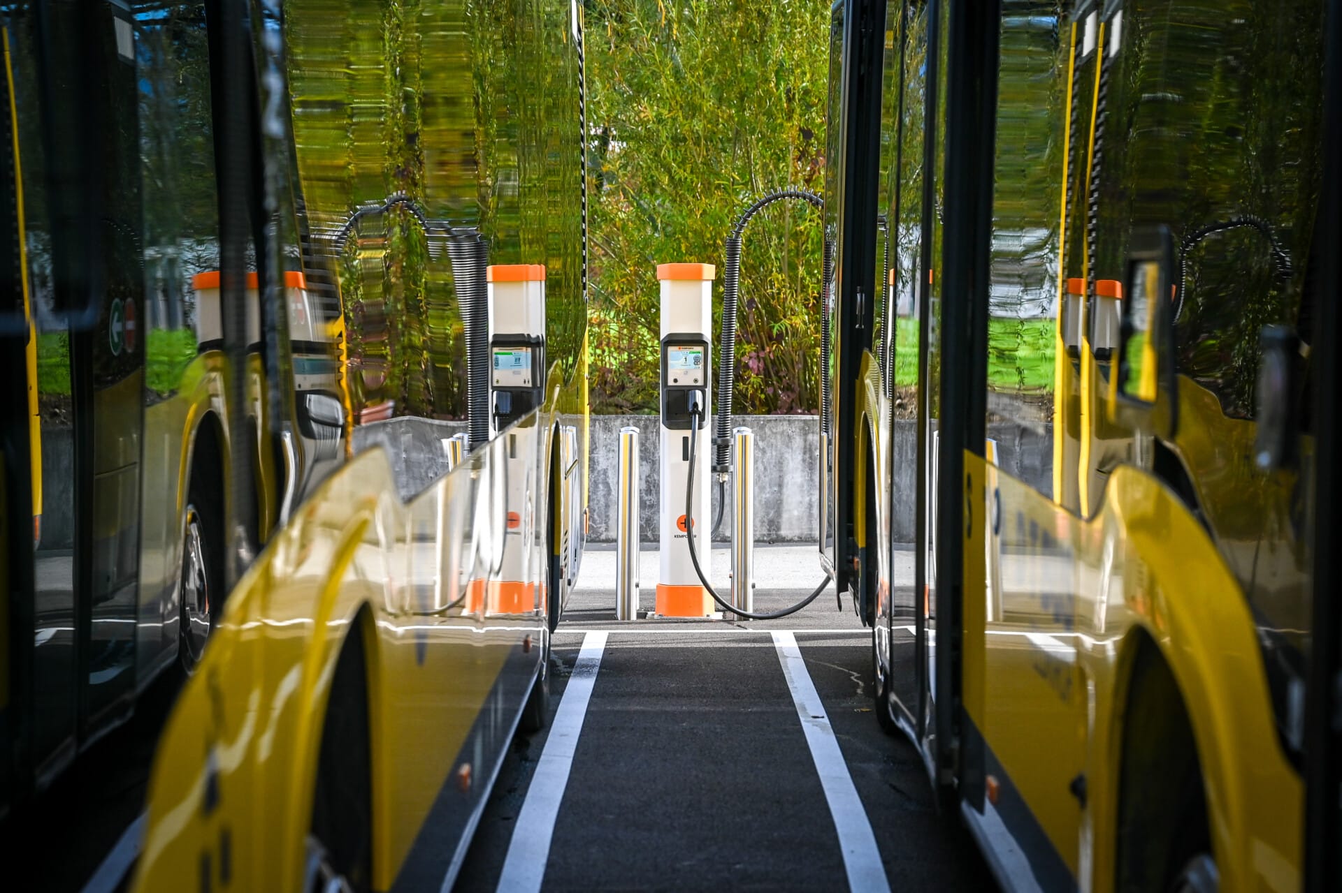 In order to ensure the smooth operation of the electric buses, a high-performance charging infrastructure was installed on the company premises. This comprises ten charging points with Kempower satellites, each offering 160 kW of power. A transformer converts medium voltage (22,000 volts) into the required voltage of 800 volts, while two Kempower Power Units with a total output of 800 kW act as rectifiers. The electric buses can be fully charged in a maximum of three hours, ensuring their continuous operational readiness.